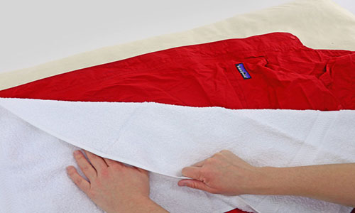 + Trải chiếc khăn tắm lên trên bề mặt áo cần ủi. Sử dụng bàn là là lên trên bề mặt khăn và di chuyển chúng liên tục. Nên nhớ đừng dùng lực ấn bàn là xuống hay ngừng việc là lại giữa chừng vì điều đó sẽ làm hỏng chiếc áo của bạn.