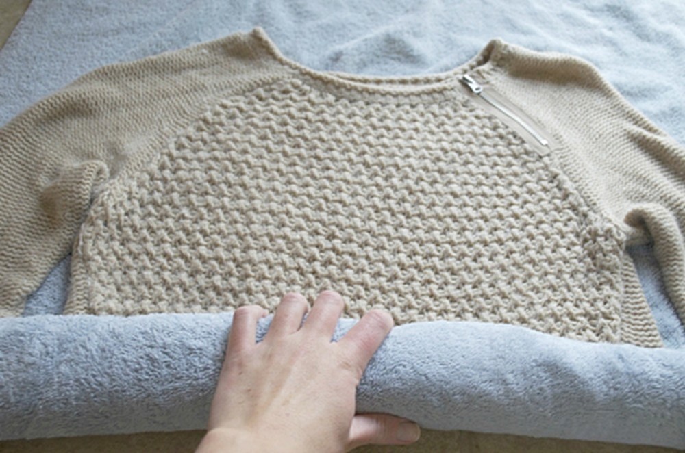 - Bước 5: Trải một chiếc khăn tắm to với khả năng thấm hút nước thật tốt ra một mặt phẳng đủ rông cho chiếc áo của bạn. Lưu ý trong cách khắc phục áo len bị giãn này, cẩn thận trải chiếc áo của bạn lên khăn, điều chỉnh về hình dáng kích thước ban đầu của áo, nhớ đừng để áo bị nhăn nhé. Để áo khô tự nhiên trong khoảng 2 ngày, thỉnh thoảng bạn sẽ phải thay khăn, khi thay khăn nhớ điều chỉnh hình dáng và kích thước của áo một cách nhẹ nhàng và cẩn thận nhé.