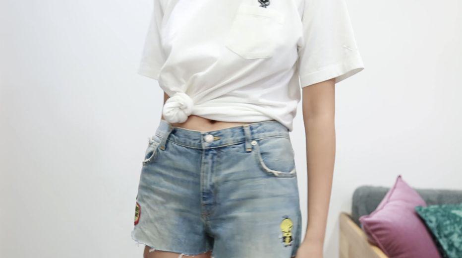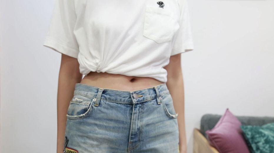 Khi mặc áo phông, bạn có thể thắt vạt áo kiểu nụ hoa để tạo nét phá cách cho chiếc áo phông truyền thống bớt tẻ nhạt.