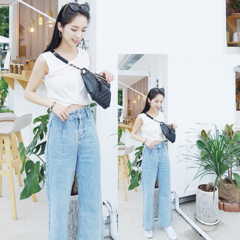 Quần jean ống rộng phối với áo phông đây là cặp bài trùng, bạn chỉ cần mix là đẹp đặc biệt là phông trắng. Bạn có thể sơ vin gọn gàng hoặc buộc vạt thành crop top là những ý tưởng không tồi.