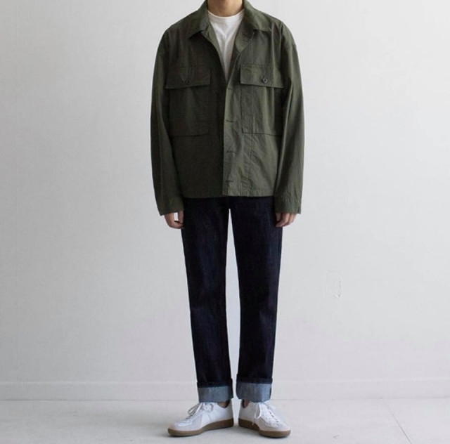 Giày thể thao trắng, quần jean ống dài xắn lai, áo font trắng kết hợp áo khoác kaki màu xanh rêu